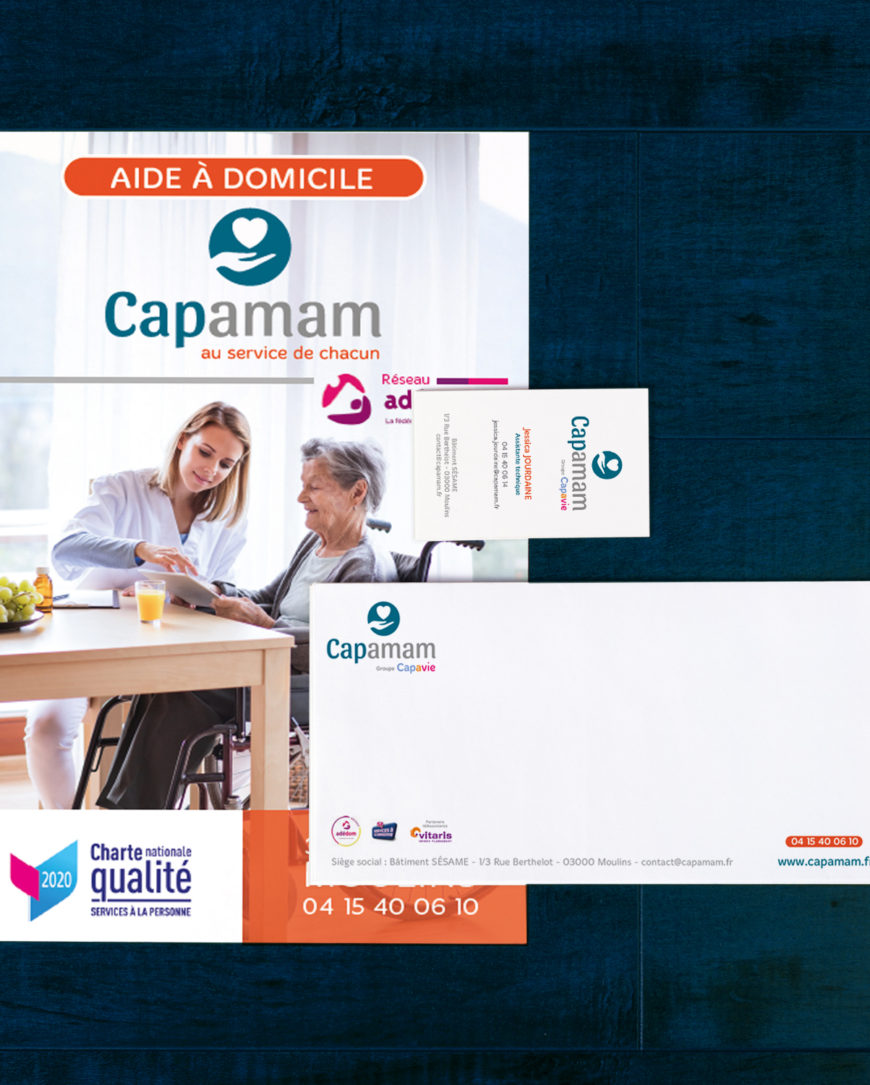 Création de carte de visite, d’affiche, de bloc de feuille personnalisé pour Capamam.